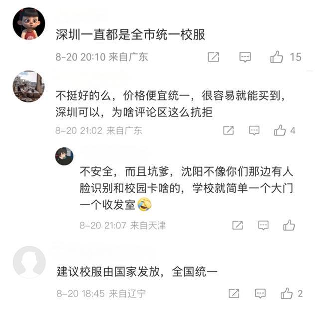 部分网友支持全市统一校服,认为深圳一直都是全市统一校服,“价格便宜统一,很容易就能买到”。