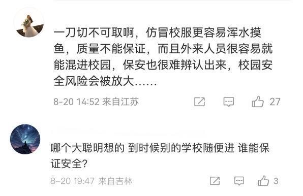 更多网友则对全市统一校服提出了质疑,尤其担忧校园安全隐患,“外来人员很容易就能混进校园,保安也很难辨认出来,校园安全风险会被放大……”