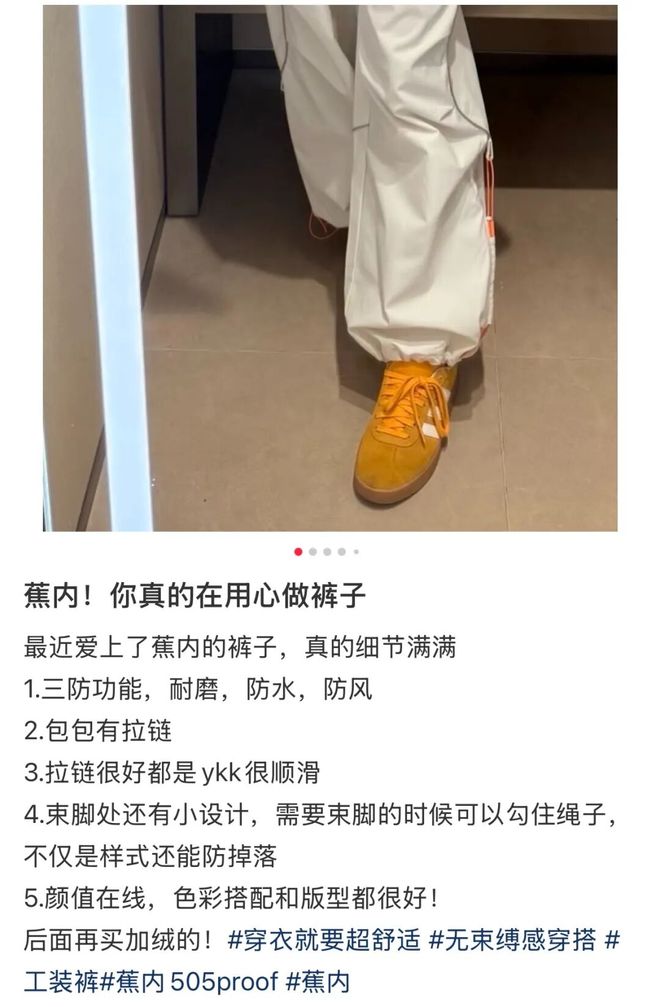 这份共鸣,最终在用户端被“看见”并放大。一位女孩在小红书发帖,细数一条蕉内裤子的满满细节:面料“三防”,每个口袋都装了YKK拉链,甚至连束脚处都有一个可以勾住绳子、防止掉落的小细节。她最后写道:“一定会回购”。