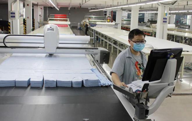 效率,则被武装到了牙齿。巨大的面料车间里,是价值数百万的德国机器在主导一切:智能系统自动标记瑕疵、计算最佳排料方案;裁剪时,机器会自动抽真空吸附面料,确保切割的绝对精准。这已经不是劳动密集型生产,而是技术密集型生产。