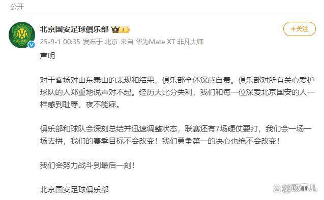 北京国安在遭遇一场惨痛的失利后深夜发表道歉声明,他们在比赛中以0比6的比分失利,对此深感自责和痛心,球队表示,他们彻夜难眠,对比赛结果感到非常遗憾和失望,他们承诺将认真反思并努力改进,以更好的表现回应球迷的期待,这次失利将激发他们更加努力和专注,为未来的比赛做好准备。