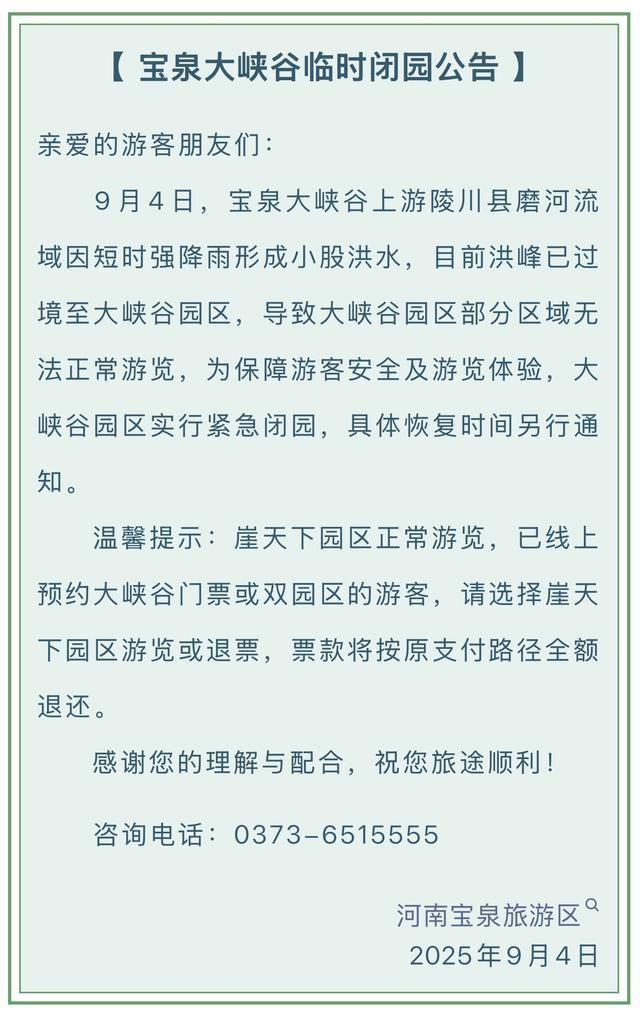 9月4日,记者从新乡宝泉景区了解到,宝泉大峡谷上游陵川县磨河流域因短时强降雨形成小股洪水,目前洪峰已过境至大峡谷园区,导致大峡谷园区部分区域无法正常游览,为保障游客安全及游览体验,大峡谷园区实行紧急闭园,具体恢复时间另行通知。