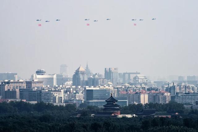 这是空中护旗梯队通过天安门广场,26架直-19武装直升机组成“80”字样。新华社记者 李明 摄