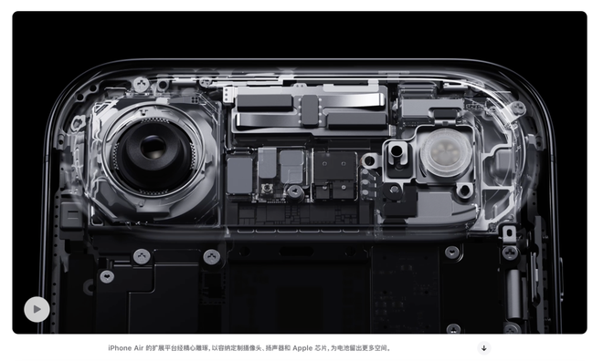 由于机身足够纤薄,iPhone Air的背面凸起设计也与以往有很大不同。根据发布会现场介绍,苹果重新设计了扩展平台,顶部平台塞下了后置摄像头、前置摄像头、扬声器和苹果芯片这些重要内部组件,目的是将其余的空间全部留给电池。