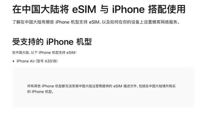 根据苹果官网9月9日更新的内容,在中国大陆地区,仅 iPhone Air(型号 A3518)支持 eSIM,所有其他 iPhone 机型都无法安装中国大陆运营商提供的 eSIM 描述文件,包括在中国大陆境外购买的 iPhone 机型。中国联通是唯一受支持的 iPhone eSIM 运营商,要在 iPhone Air 上激活 eSIM,用户需要前往中国联通营业厅办理。另外,当用户在中国大陆境外旅行时,可以在从中国大陆购买的 iPhone Air(型号 A3518)上,激活当地运营商提供的 eSIM,但必须启用定位服务才能进行这项操作。