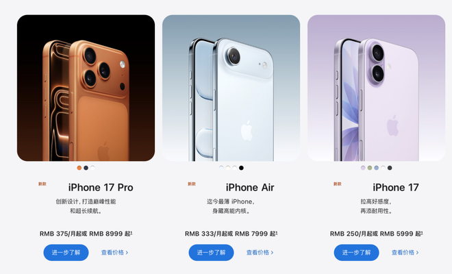 iPhone Air有四种颜色选择:天蓝色、浅金色、云白色、深空黑色,三种存储容量选择:256GB、512GB、1TB,价格分别为7999元、9999元、11999元;