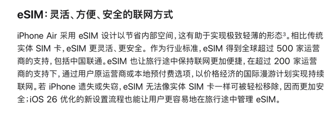 仅 5.6 毫米机身厚度也意味着, iPhone Air 将没有空间留给实体 SIM 卡。根据苹果官方介绍,iPhone Air 将在全球市场统一采用仅支持 eSIM 的设计,不再配备实体卡槽。