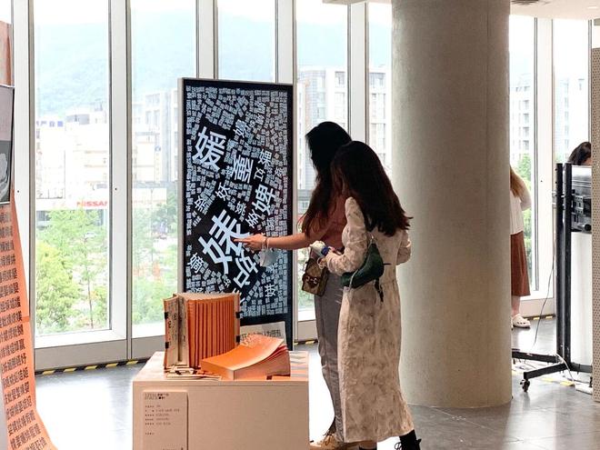 在杭州良渚文化艺术中心举办的《女字旁》新书特展上展示的“媛”“媚”等字。(图/受访者提供)