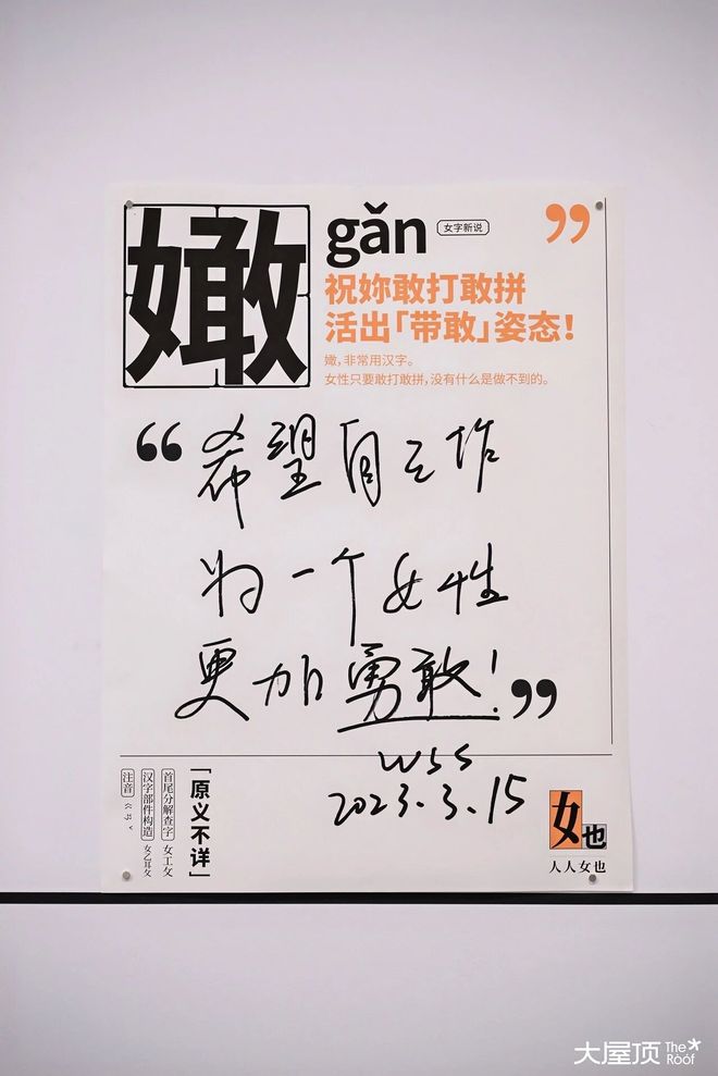 直到有一天,王洋洋在图书馆偶然翻阅《汉语大字典》,注意到“女”部的汉字,大多带有“柔弱”“顺从”的释义。汉字中是否也存在某种性别偏见?灵光一闪间,她决定以女字旁汉字为视觉载体,原本飘渺的概念,突然有了坚实的根基。