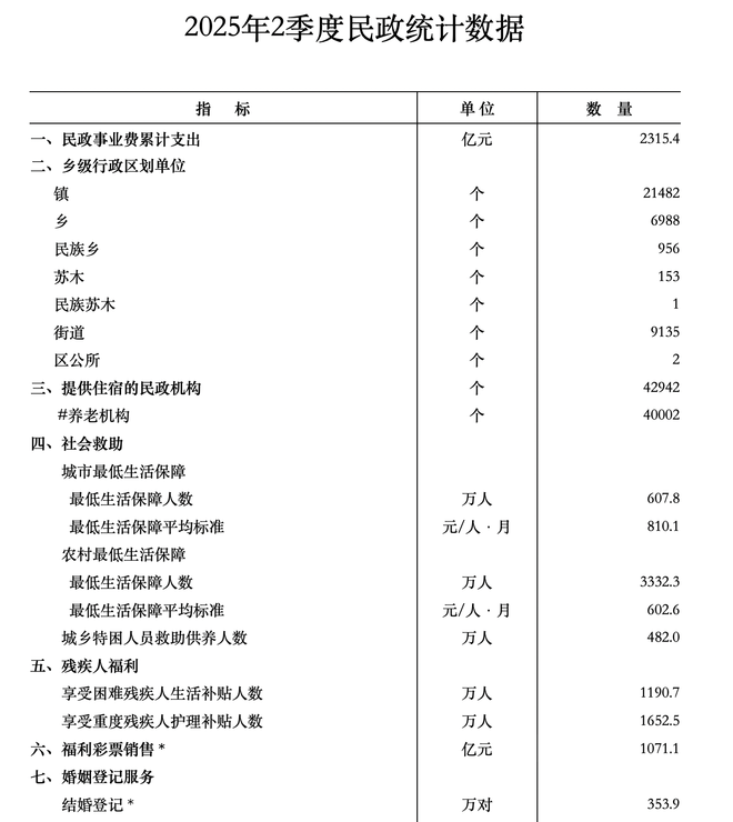 2025年7月30日,民政部官网公布了《2025年2季度民政统计数据》,数据显示,第2季度全国结婚登记共353.9万对。(图/民政局官网)