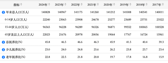 2017年-2024年人口年龄结构和抚养比。(图/国家统计局)