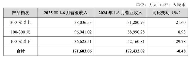 从经营数据来看,上半年,300元以上的产品(金徽年份系列、金徽老窖系列等)实现营收3.8亿元,同比增长21.6%;100—300元产品(包括柔和金徽系列、金徽正能量系列、世纪金徽五星等)营收9.69亿元,同比增长8.93%;100元以下的平价产品(世纪金徽四星、三星、二星,金徽陈酿等)则出现大幅下滑,营收3.66亿元,同比减少29.78%。