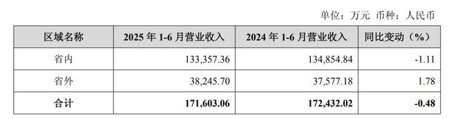 需要注意的是,今年上半年其在省内市场业绩罕见下滑,营收13.34亿元,同比下降1.11%。