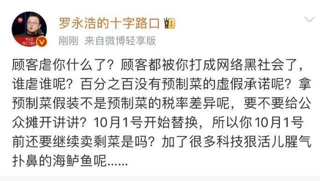 9月10日,罗永浩在微博发言吐槽西贝全是预制菜,从而引发舆论关注。