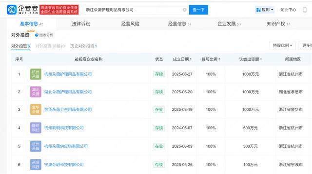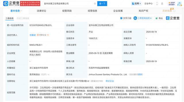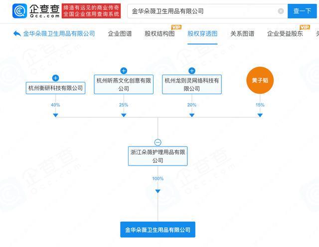 企查查APP显示,近日,金华朵薇卫生用品有限公司成立,法定代表人为徐嘉斌,注册资本1000万人民币,经营范围包括卫生用品和一次性使用医疗用品生产、卫生用品和一次性使用医疗用品销售、个人卫生用品销售等。企查查股权穿透显示,该公司由浙江朵薇护理用品有限公司全资持股,后者由杭州衡研科技有限公司、杭州昕燕文化创意有限公司、杭州龙则灵网络科技有限公司、黄子韬共同持股。值得一提的是,今年以来,浙江朵薇护理用品有限公司已在杭州、宁波、孝感成立了4家公司。