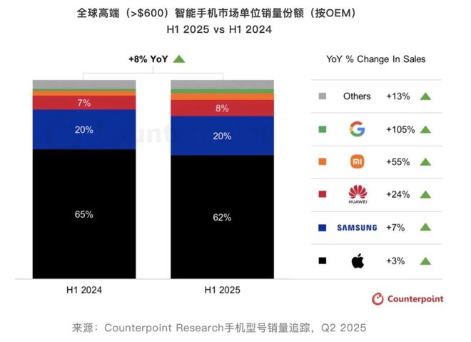 根据Counterpoint Research报告,2025年上半年,全球高端智能手机销量同比增长8%,创上半年历史新高;增速高于同期仅同比增长4%的全球智能手机总市场。整体来看,高端市场贡献了全球智能手机营收的60%以上,其战略重要性不言而喻。