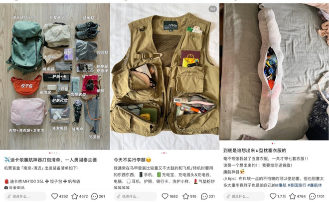 而当行李箱装不下时,“穿在身上”成了最后的解法。工装马甲、登山包、U型枕套和登机神裤逐渐被定义成廉航的“登机神器”。电商平台显示,某款售价58元的钓鱼马甲销量超过万件。