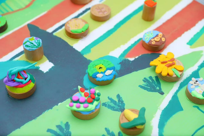 同一天,在张程小学四年级的美术课堂上,谷雨公益志愿者们又通过不一样的美育教育活动,放飞孩子们的创意想象。课堂上,固原隆德地区特有的梯田风貌被制作成巨幅的“画板”,而从全国各地会员以及谷雨员工投递的空瓶木盖则成为创意的原点。孩子们用五颜六色的粘土和彩笔,为大小不一的木盖进行装饰:黄橙橙的玉米、湛蓝色的天空、红彤彤的枸杞、明艳艳的山花……孩子们想象让木盖完成了“变装”,并最终妆点在巨幅的梯田画板上,像是让不同的梦想长在了固原“希望的田埂”上。