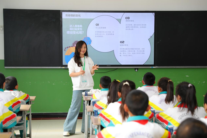 “雨木共生”不只是送来桌椅。9月5日当天,一堂皮肤健康科普课走进张程小学六年级的教室,谷雨科学传播官在课堂上拿出紫外线测试卡,同学们惊讶地看着卡纸上的颜色一格一格变深,第一次直观地理解了阳光的“威力”,也懂得了防晒的重要性。课堂上,谷雨也捕捉到了即将进入青春期的小小肌肤烦恼,通过生动的皮肤构造讲解和日常洗护小技巧,让孩子们获得了以往课堂之外的新知识。