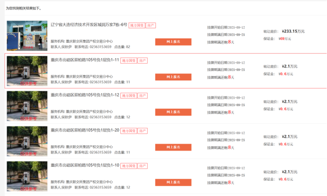 在70余处挂牌资产里,车位占绝对多数,共计68个,全部位于正源橡园小区,单个车位的转让底价为2.1万元。转让公告明确要求,仅限正源橡园小区业主凭房屋产权证参与受让,且每个产权证只能对应购买一个车位。