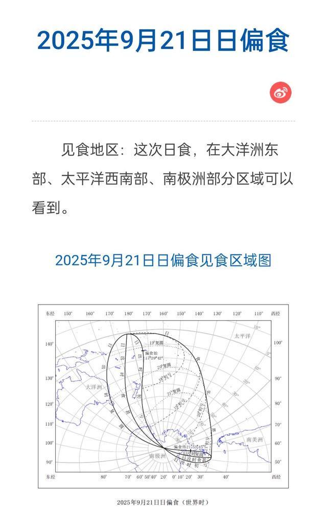 记者还注意到,中国科学院紫金山天文台官网更新了一则科普动态内容也提到,今年9月21日有日偏食,在大洋洲东部、太平洋西南部、南极洲部分区域可以看到,未包括中国。