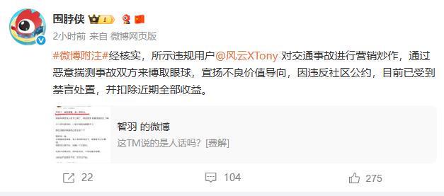 其表示,该用户是对交通事故进行营销炒作,通过恶意揣测事故双方来博取眼球,宣扬不良价值导向,违反社区公约。