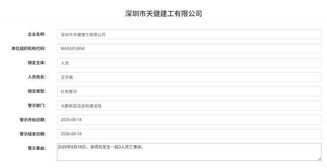 南都·湾财社记者从深圳市住建局获悉,深圳市天健建工有限公司(简称“天健建工”)及其人员王宇嵩近日被大鹏新区住房和建设局处红色警示1年,警示时间段为2025年8月18日至2026年8月18日。警示事由为2025年8月18日,该项目发生一起3人死亡事故。