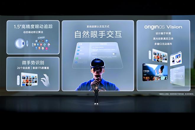 vivo Vision探索版自然精准的操作体验,让交互轻松上头。产品搭载了基于“负设计”理念的全新OriginOS Vision系统。源于大自然的灵感让图标和窗口格外真实地存在于用户眼前,信息的呈现不再被困于小小的屏幕,而是自然地浮现在周围的空间中。操作方式从“隔着屏幕点”,变成了“眼一看,手一动”,准确无误的掌控空间。历时四年的深耕打磨,vivo Vision探索版实现了1.5°高精度眼动追踪,相当于站在2米外看一块手表大小的精准定位,加上26个自由度的指尖级手势识别和垂直175度的识别范围,为用户带来了自然精准的交互感受。