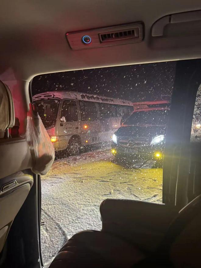 当时天气晴朗,我们本以为能顺利离开。但刚开了几公里,出景区的山路就陷入了拥堵。起初,我们听说前方有旅游大巴和房车侧翻,正在处理事故。在等待的过程中,天空开始飘起小雪,随后雪越下越大,乃至车辆完全无法动弹。