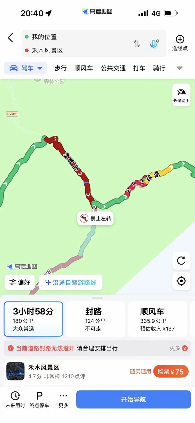 10月4日我们抵达喀纳斯时,山上已有积雪,但道路还算通畅。我们当晚入住了景区内的家庭房。然而,5日一早,景区的公共交通就全部停摆了,我们只能步行游览部分景点。下午2点,我们乘坐恢复通行的第一班区间车下山,到达山脚下的贾登峪游客中心,在下午3点多开上了车,准备自行离开。