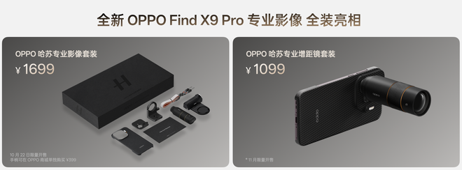 作为 OPPO 30 周年巨献之作,Find X9 系列以画质革命彻底重构影像体验,用全面进化的性能、续航、护眼好屏与更流畅更智慧的系统,精准解决用户核心痛点,强势打造新一代旅拍神器。Find X9 系列 4399 元起售,10 月 22 日正式开售;Find X9 Pro 卫星通信版 11 月开售,并将率先支持 eSIM。OPPO与哈苏联合打造的哈苏专业影像套装售价 1699 元。
