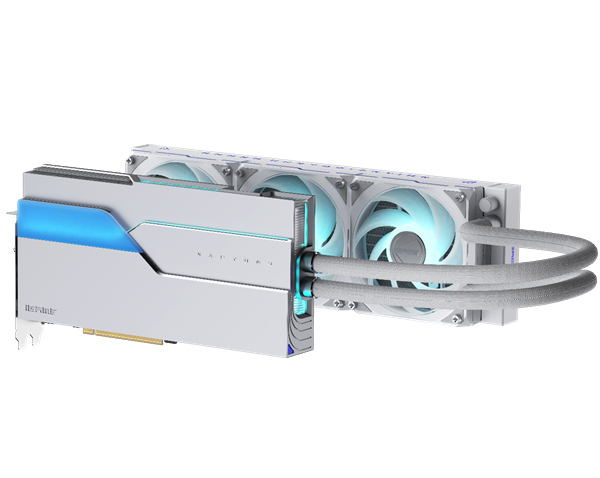 与黑色版最大区别在于Vulcan W采用了3+1风镰扇叶设计,除了正面三把107mm风扇外,背板还额外配备了一颗107mm反叶风扇,同样可一键超频至2017MHz-2527MHz。