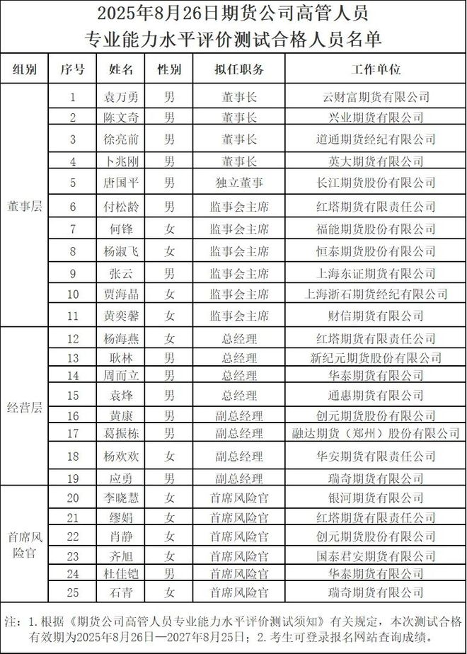 8月26日,中国期货业协会发布新一期期货公司高管人员专业能力水平评价测试合格人员名单。