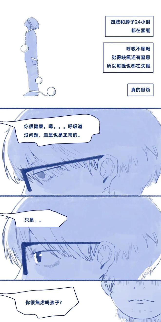 发现自己状态不对劲之后,我去看了心理医生,然后确诊了比较严重的焦虑症躯体化。睡觉的时候,我经常会呼吸不上来,把自己憋醒,而且只要走出我的房间,来到外面的环境,我就会有种不安全感。焦虑症带给我最大的影响,除了躯体化外,应该是我三年多以来都没办法以一种平稳的心态和他人社交。在学习和工作上,也觉得自己精力非常有限。在一次和朋友的小型聚会中,我的眼前突然发黑,站也站不稳,只能让旁边的人帮我叫救护车。其实我的压力和恐慌并不是来自那个社交场景,而是没有太多的能量去支撑我进行社交。那时候,可能很多人见到我的第一印象,除了胆小,就是自卑。而当我想到我无法和别人正常交流互动,也会反过来引起我的焦虑。这是一个恶性循环的过程。