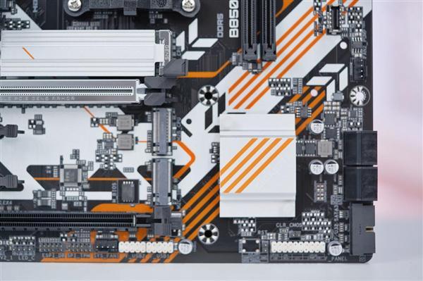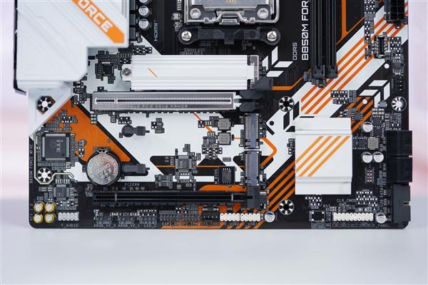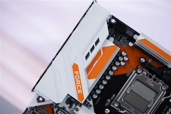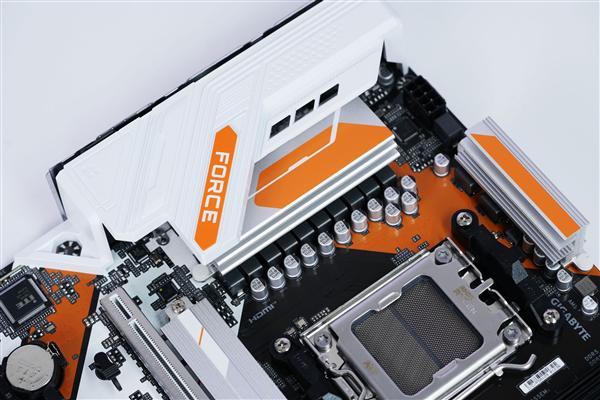 技嘉B850M FORCE WIFI6E主板以标准M-ATX板型为基础,采用经典黑橙白三色撞色设计,兼顾紧凑机身与视觉冲击力,成为中端装机方案的性价比之选。